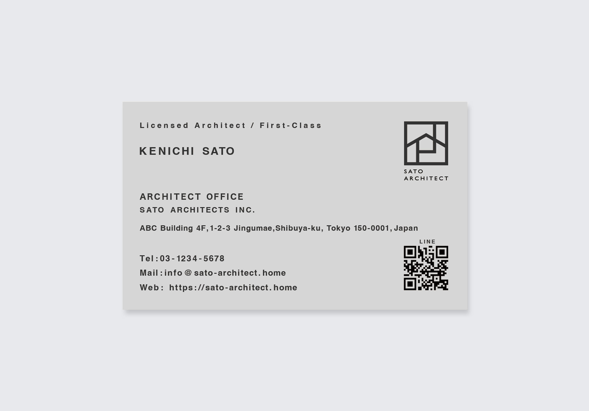 この名刺は、建築士に求められる「誠実さ・精度・美意識」をミニマルに表現したデザインで、広く取られた余白によりロゴと氏名が自然に視界へ入り、静かな安心感を与えます。