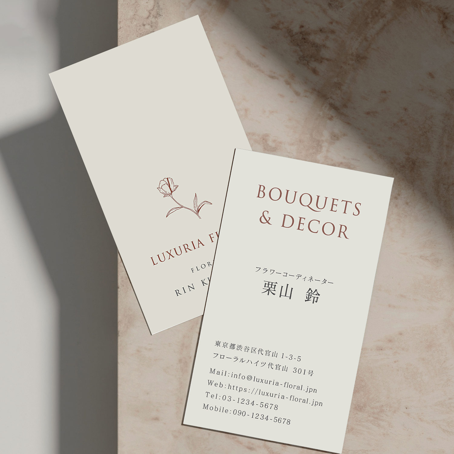余白、文字組み、線画のトーンが三位一体となった本デザインは、フローリスト・花の仕事に携わる方々の品格を引き立てる、上質な名刺の好例と言えるでしょう。